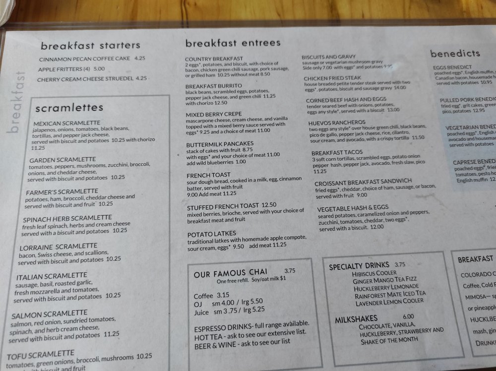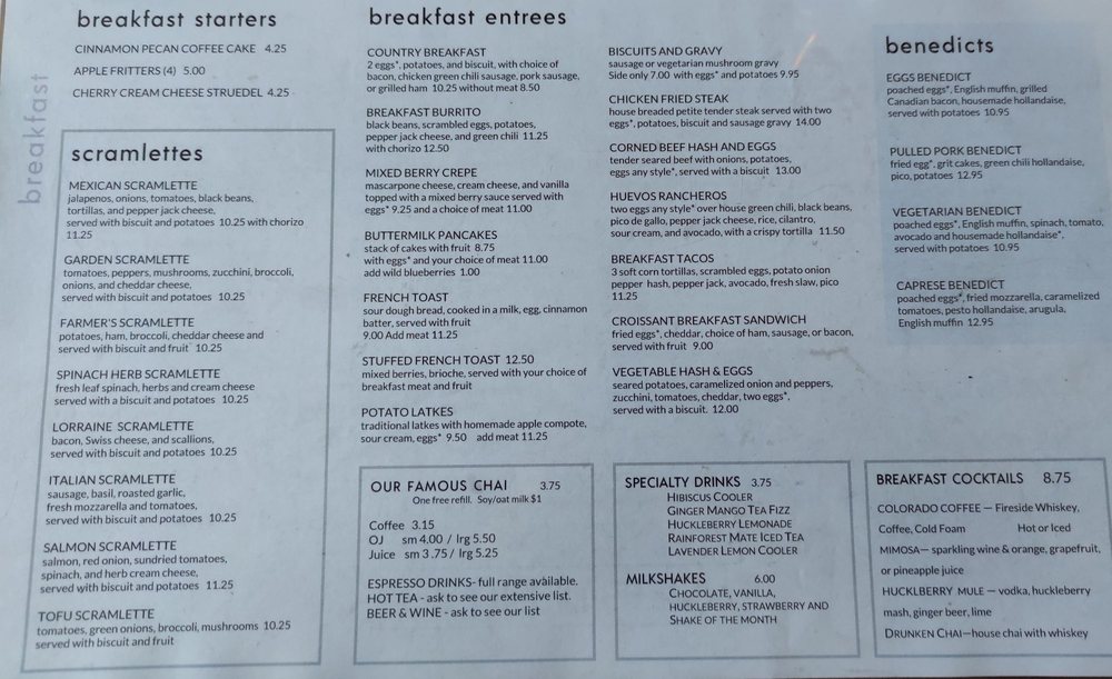 The Huckleberry, an American breakfast and brunch spot in Louisville, CO, offers a cozy farmhouse atmosphere with a diverse menu catering to both meat-eaters and vegetarians. With options like Mac and cheese with grilled chicken, BLT with fried green tomatoes, and vegetarian Benedict with collard greens, there's something for everyone. Customers praise the delicious comfort food, friendly staff, and reasonable prices. The dessert selection, including bourbon pie, huckleberry, and peach pies, is a must-try. The restaurant's ambiance, extensive tea selection, and efficient service make it a popular choice for weekend brunch. Overall, The Huckleberry is a delightful dining destination for those looking for quality food and a pleasant dining experience.
